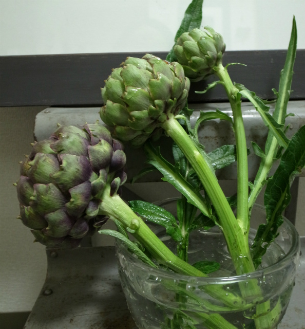 先週、土曜クラスで生徒さんがご自宅の庭で育ったアーティチョークを持って来て下さったので、早速アトリエに飾りました。 色といい形といい絵になる植物ですね!